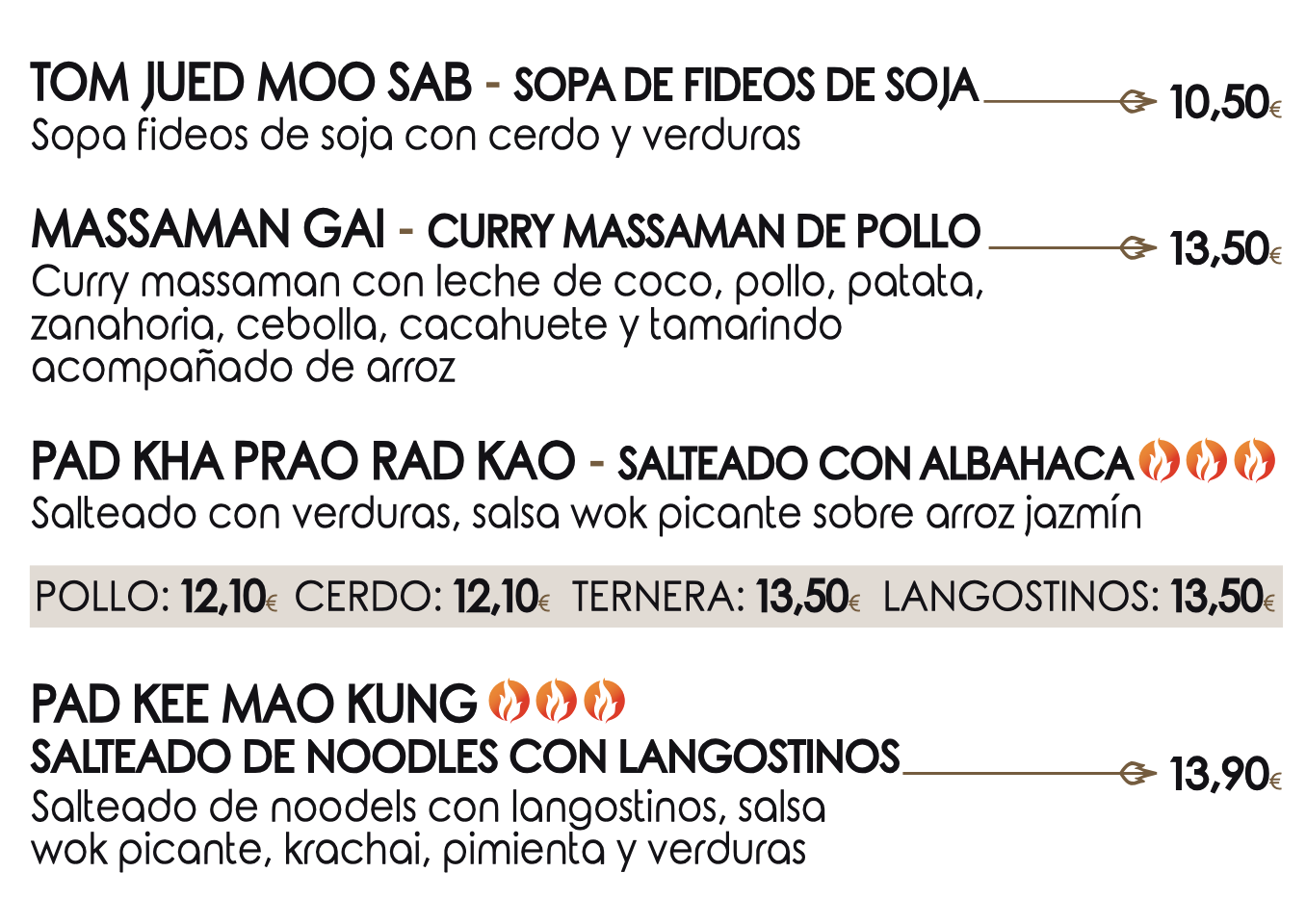 En Thaïlande, nous adorons jouer avec les différentes saveurs pour tenter de trouver l’équilibre parfait : salé, sucré, aigre… Y parvient-on? Le Pad TAI en est le meilleur exemple. Goûtez ce délicieux sauté de nouilles de riz avec de la viande, des œufs, du tofu, des germes de haricots, de la sauce au tamarin, du piment et des cacahuètes hachées! C’est commettre un péché que de quitter Baan Thai sans l’avoir goûté!